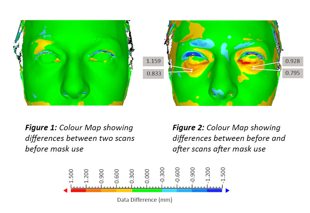 The test subject was scanned before and after 1 week of consistent mask use at a National University of Singapore lab. Using overlay analysis tools, the under eye area showed a 0.8mm to 1.2mm reduction in volume of the under-eye area or on average a 67% improvement in eye puffiness.